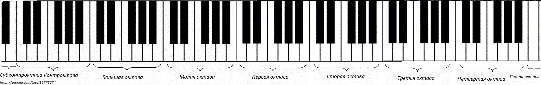 Обычно у фортепиано семь полных октав (контр-, большая, малая, 1-4) и две неполные (субконтр- и пятая) октавы.