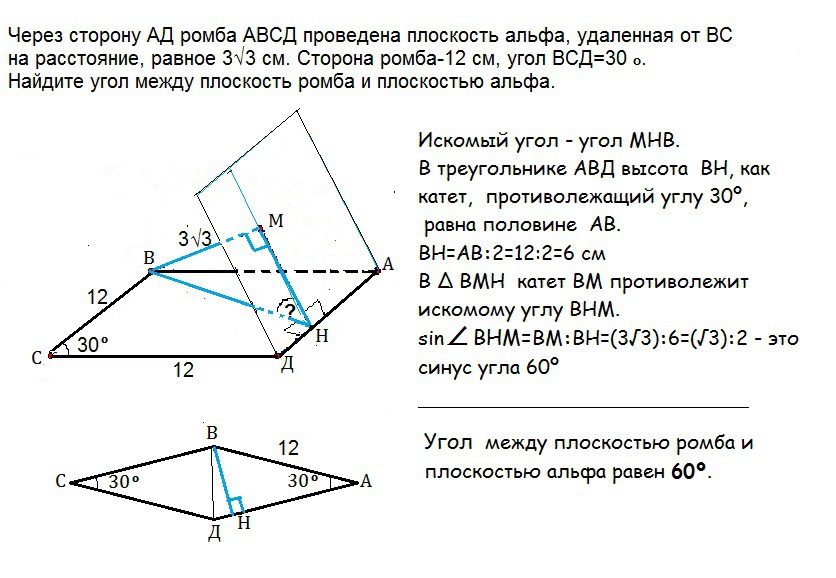 Через сторону АД ромба АВСД проведена плоскость альфа, удаленная от ВС на расстояние, равное 3√ 3 см. Сторона ромба-12 см, угол ВСД=30º. Найдите угол между плоскость ромба и плоскостью альфа