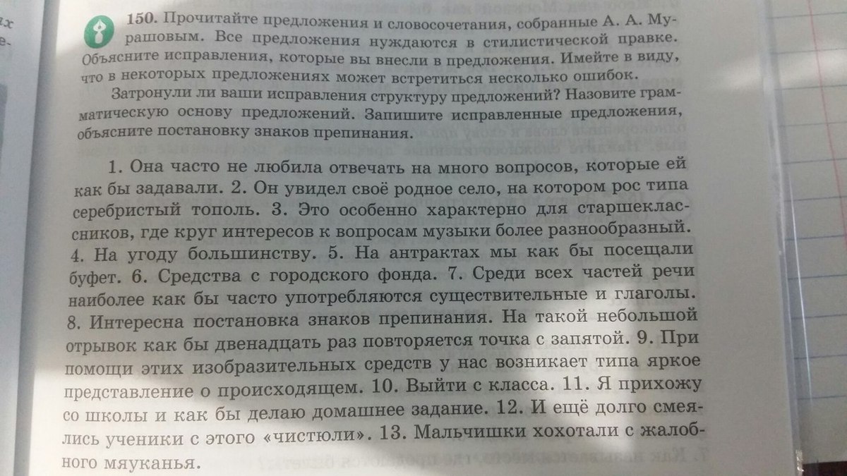 2,9 Типа - убрать 3. К вопросам - по вопросам 4. На угоду - в угоду. 5,7,8,11 Как бы - убрать 6. Предлог убрать. 10. с класса - из класса 12. и еще - убрать 13. хохотали с - хохотали из-за