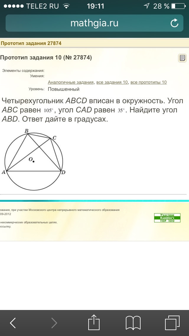 Четырёхугольник ABCD вписан в окружность. Угол ABC равен 105 градусов угол CAD равен 35 градусов найдите угол ABD ответ дайте в градусах