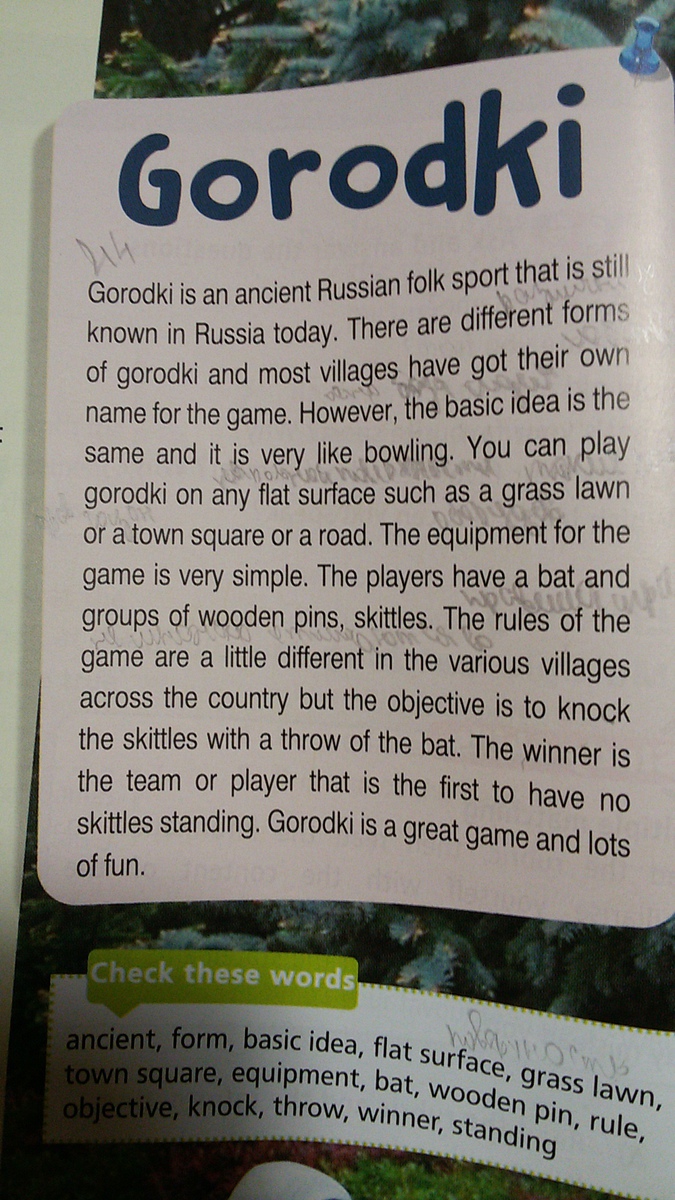 городки это старинная русская народная игра,которую сейчас в России знают все.Есть различные виды городков,большенство деревень придумывают свои названия для этой игры.Эта игра очень похожа на боулинг.Ты можешь играть в неё дома,на траве,в городском парке или на улице.Правила этой игры очень просты.Игроки имеют биту и деревянный палки,кегли. равила игры немного отличаются в различных деревнях по всей стране, но цель состоит в том, чтобы сбить кегли броском биты.Победитель тот кто первый собьёт кегли.Городки замечательная игра и очень весёлая.