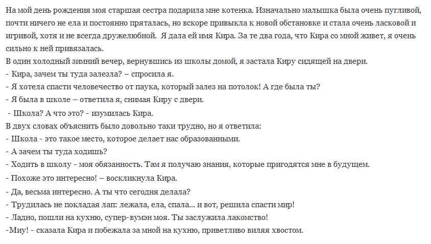 На мой день рождения моя старшая сестра подарила мне котенка . Изначально она была очень пугливой,почти не ела и пряталась.Но вскоре она привыкла к новой обстановке ,