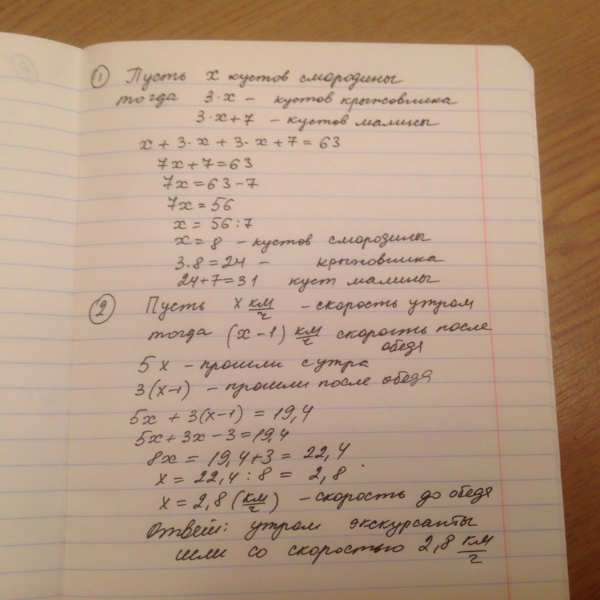 Экскурсанты за день прошли 19,4 км. С утра они шли 5 час(-а), а после обеда еще 3 час(-а). Сколько километров экскурсанты прошли утром, если после обеда их скорость снизилась на 1 км/ч. С какой скоростью шли экскурсанты утром?