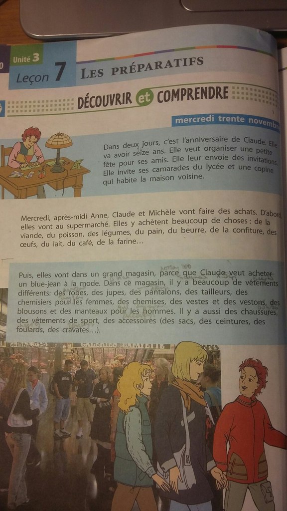 В среду, в обед Анна, Клода и Мишель собираются делать покупки ( идти за покупками). Сначала они идут в супермаркет.Там они много чего покупают: мясо, рыба, овощи, хлеб, сливочное масло, варенье, яйца, молоко, кофе и мука
