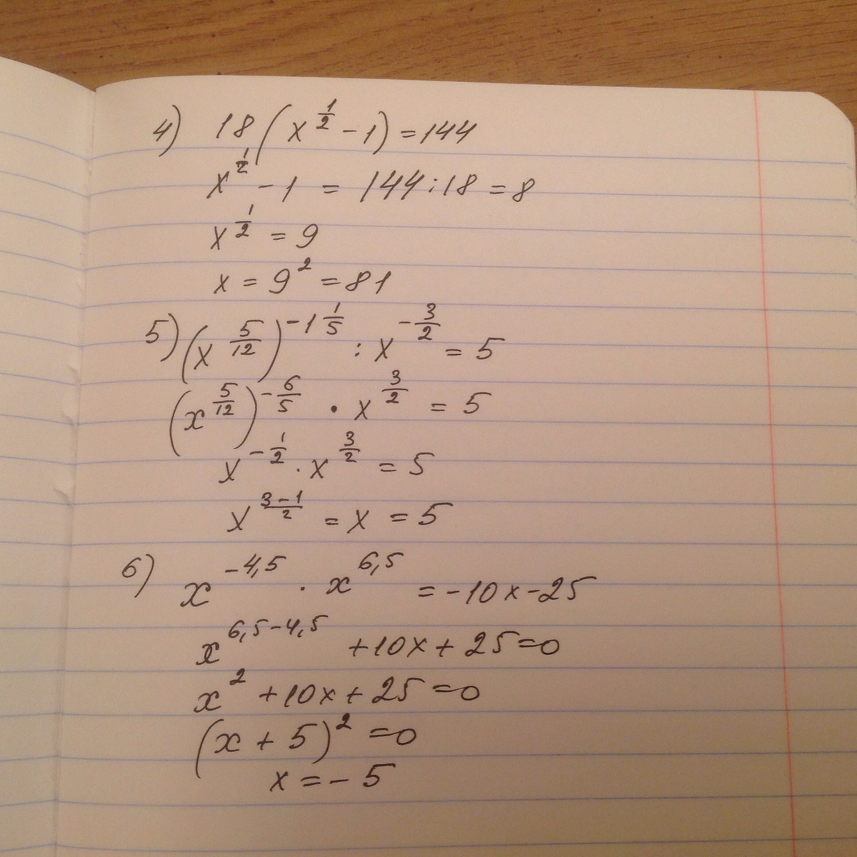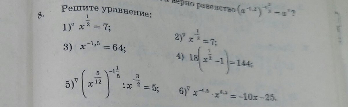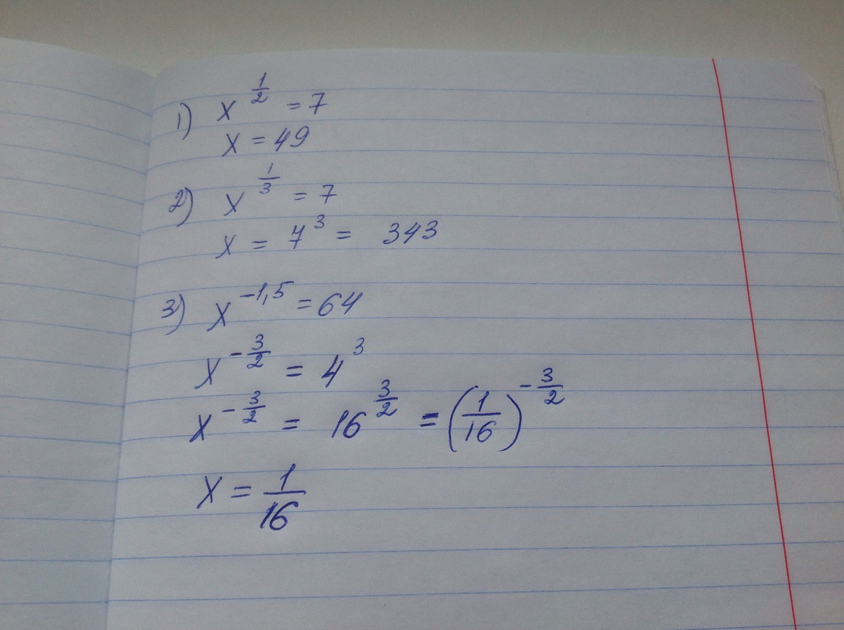 1) х^(1/2)=7 х=7^2=49 2) х^(1/3)=7^3=343 3) х^(-1.5)=64 х ^3= 16 ^(-3) х=16^(-1) х=1/16