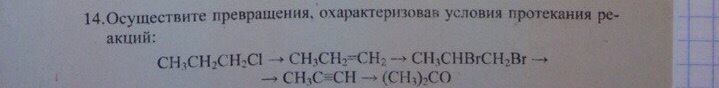 C3H7Cl [спиртовой раствор щелочи, КОН,t]=CH3-CH=CH2+KCl+H2O ; далее +Br2(бромирование под t)=CH3CH(Br)-CH2(Br) ; далее дегалагенирование [спирт.раствор берем щелоч в избытке 2NaOH]=C3H6+2NaBr+2H2O ; далее гидратация [t 140, H2SO4] образуется кетон [водород присоединен к более гидрогенизированному атому углерода кислород к менее] (H3C)2CO