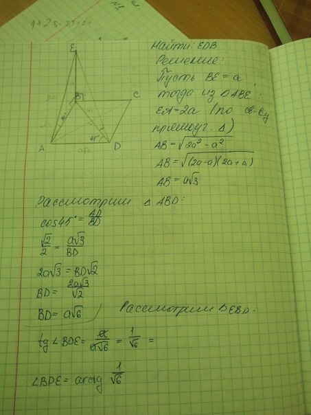 дано ABCD - квадрат , BE перпендикулярна ABC, угол EAB=30 градусам. Найти угол между ED и плоскостью AB
