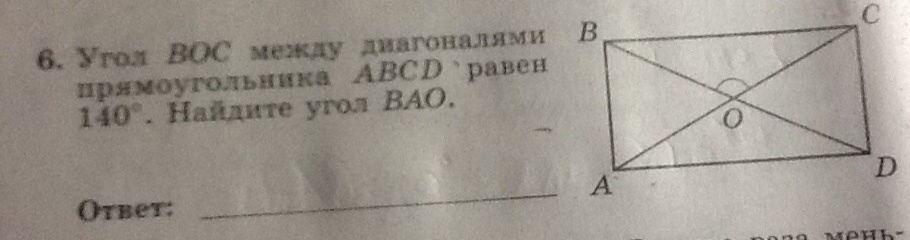 Треугольник АВС равнобедренный с основанием АВ (диагонали прямоугольника в точке пересечения делятся пополам). Углы при основании равны. Сумма углов треугольника равна 180°.