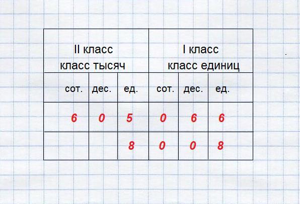 запиши и прочитай число которое состоит из : а)66 единиц первого класса и 605 единиц второго класса ; б) 8 единиц первого класса и 8 единиц второго класса. сколько единиц каждого разряда содержит каждое из этих чисел? Разложи их на сумму разрядный слагаемых. Что обозначает каждая из цифр 5 , 6 , 8 , 0 в записях этих чисел?
