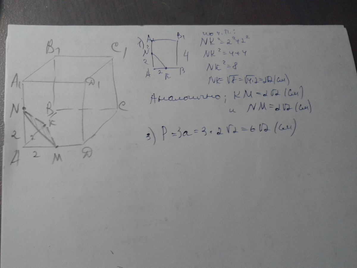 КУБ - ABCD A1B1C1D1. Пусть диагональ грани куба равна 4 см. Постройте сечение куба и найдите его периметр, если это сечение должно проходить через середины рёбер: AB , AD, AA1