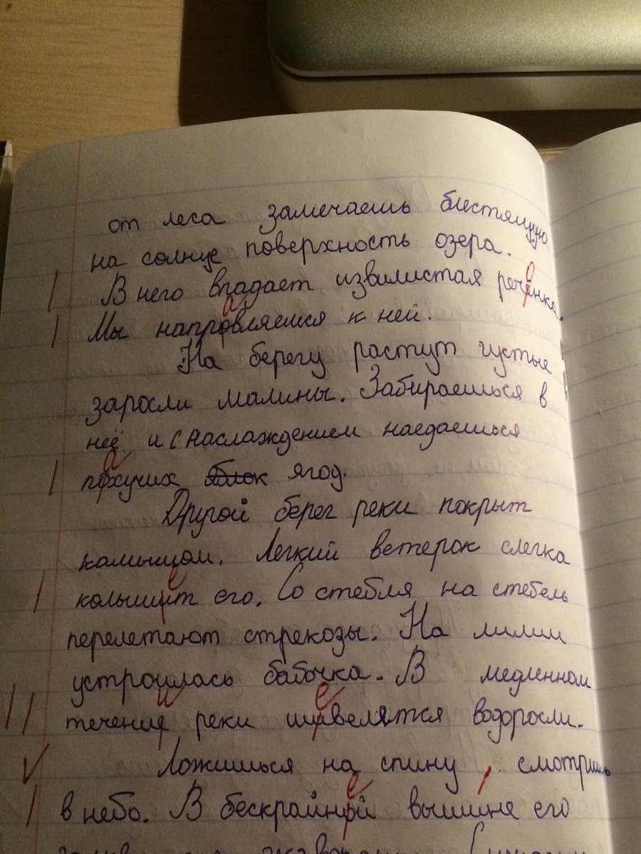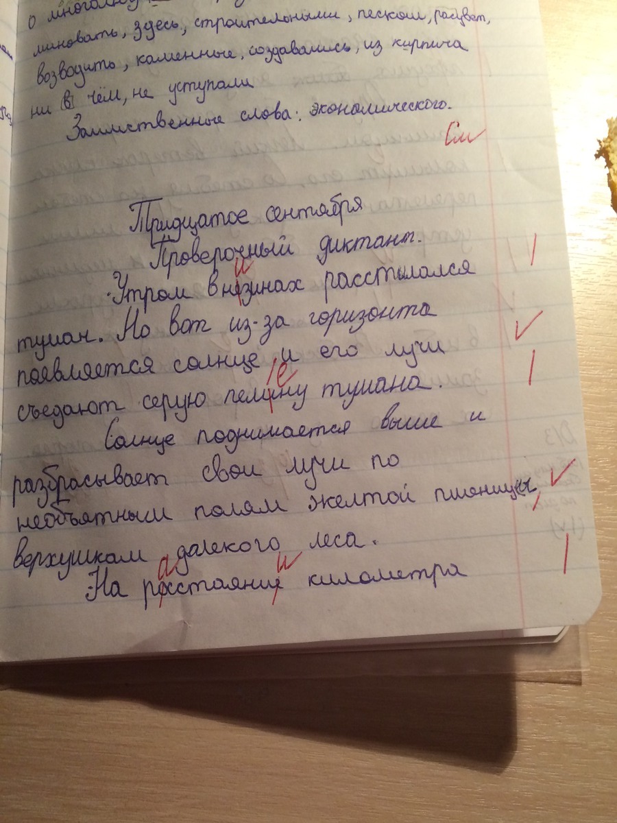 Низинах, проверочное слово - низ. В предложении: "Но вот из-за горизонта появляется солнце, и его лучи съедают серую пелену тумана" нужно выделить грамматические основы (появляется солнце, лучи съедают). Пелена, проверочное слово - пелёнка. В предложении: "Солнце поднимается выше и разбрасывает свои лучи по необъятным полям жёлтой пшеницы, верхушкам далёкого леса" нужно подчеркнуть однородные члены предложения (полям, верхушкам, жёлтой, далёкого, пшеницы, леса.). Расстоянии - проверить букву "а" нельзя, т.к. это словарное слово, буква "и" на конце слова, т.к. слово стоит в предложном падеже. Речонка - буква "о" пишется, потому что ударение идёт на суффикс. Направляемся - словарное слово. Пахучих - пахнет. Колышет - "ет", потому что это глагол 1 спряжения. (в) течении - буква "и", т.к. слово в предложном падеже. Шевелятся - словарное слово. В предложении: "Ложишься на спину, смотришь на небо." стоит запятая, т.к. здесь есть однородные члены предложения и нет союза. В бескрайней вершине - в слове "бескрайней" пишется окончание "ей", т.к. слово существительное сопровождающее данное слово, стоит в предложном падеже и имеет окончание "е".