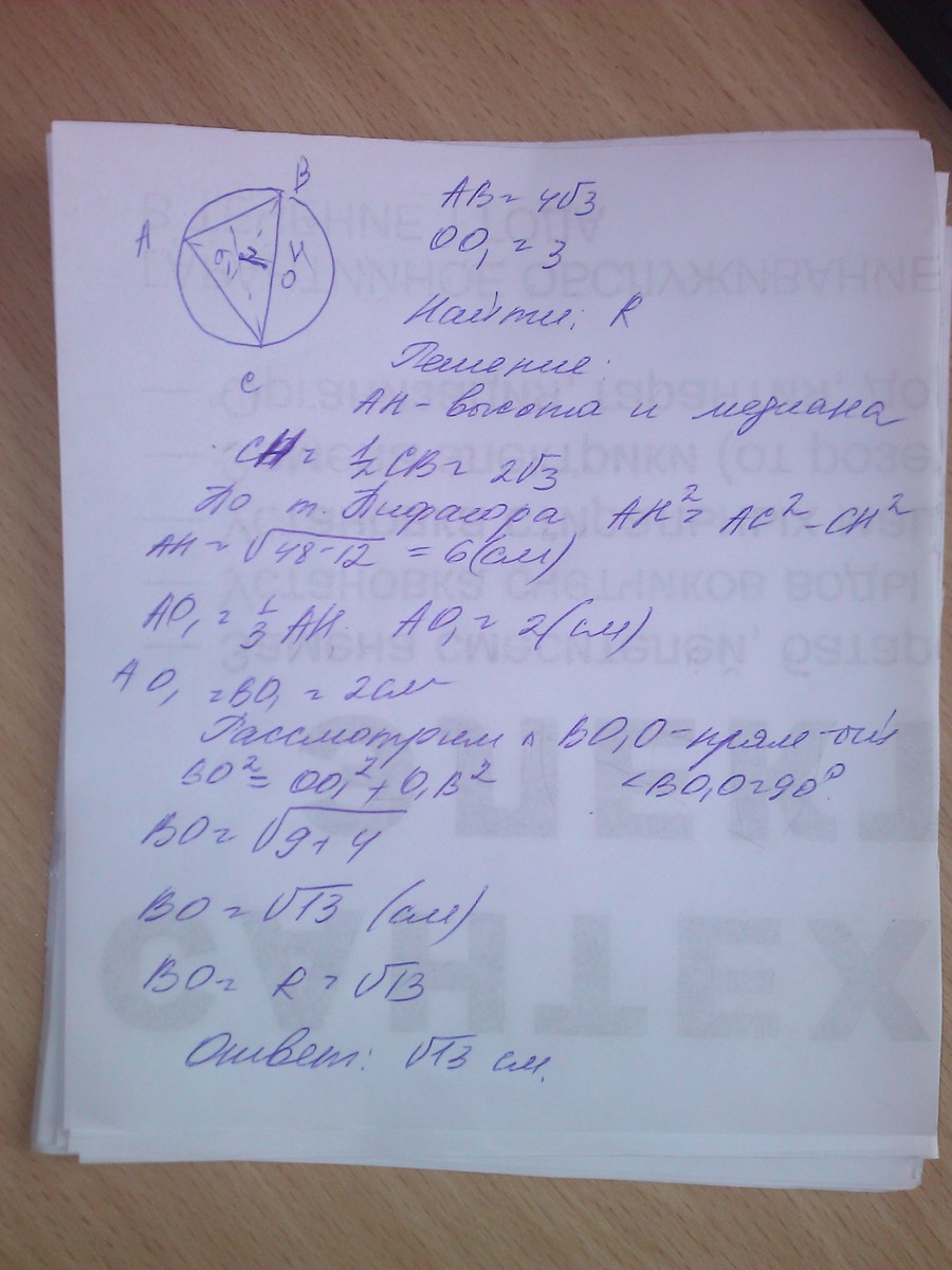 вершины равностороннего треугольника со стороной 4 корней 3 см принадлежат сфере. растояние от центра сферы до плоскости треугол равно 3 см.найти радиус сферы.
