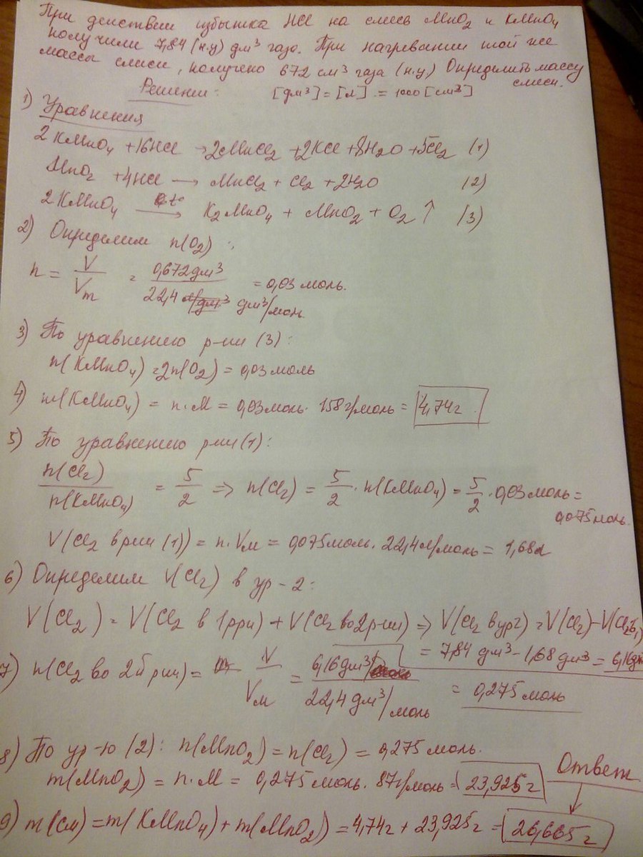 При действии избытка соляной кислоты на смесь MnO2 и KMnO4 выделилось 7,84 дм3 газа (н.у.), а при нагревании такой же массы этой смеси получено 672 см3 газа (н.у.)