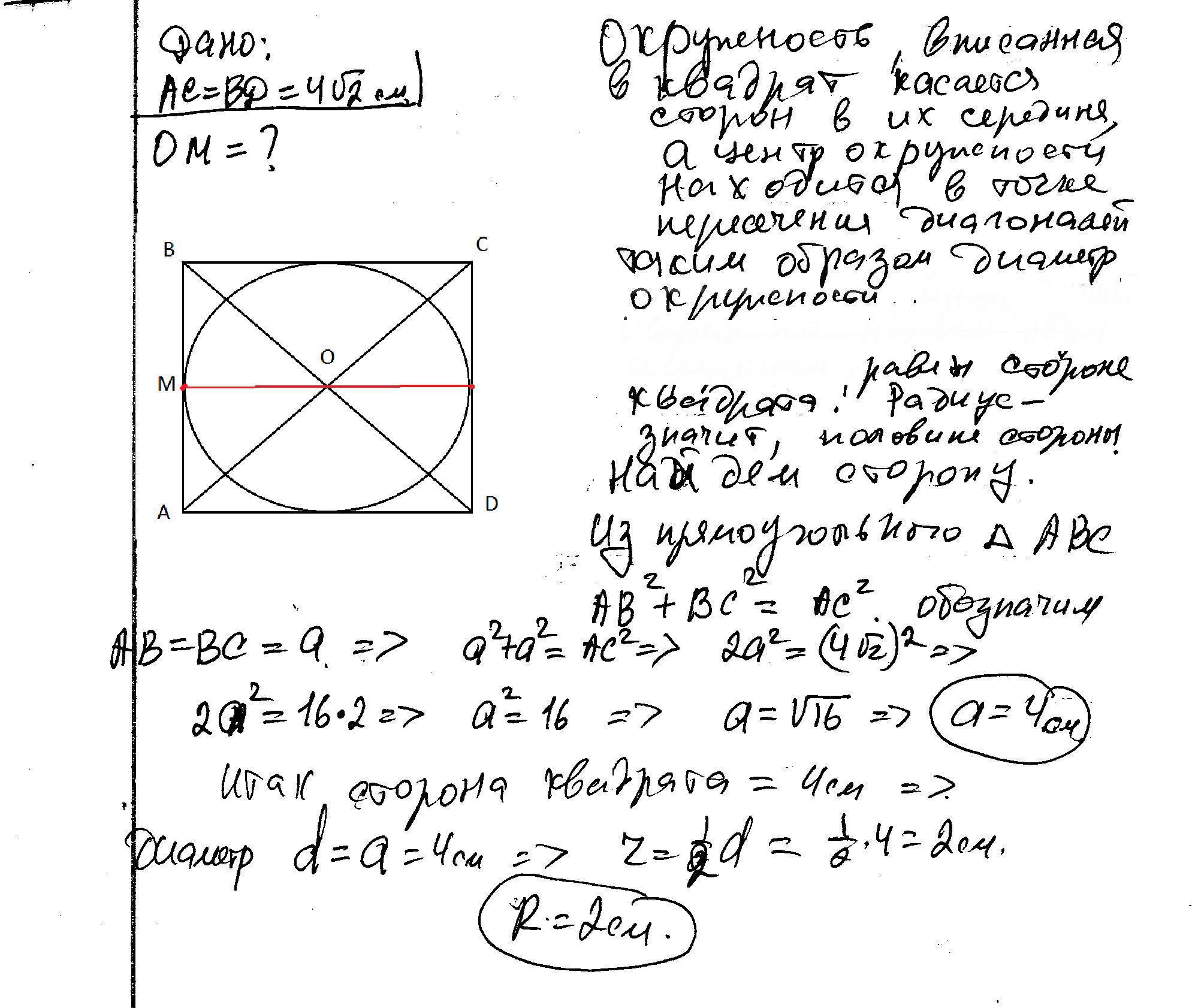 Найдите радиус вписанной в квадрат окружности, если диагональ квадрата равна 4 корень из 2 см тоже ваще срочно на см сижу:(