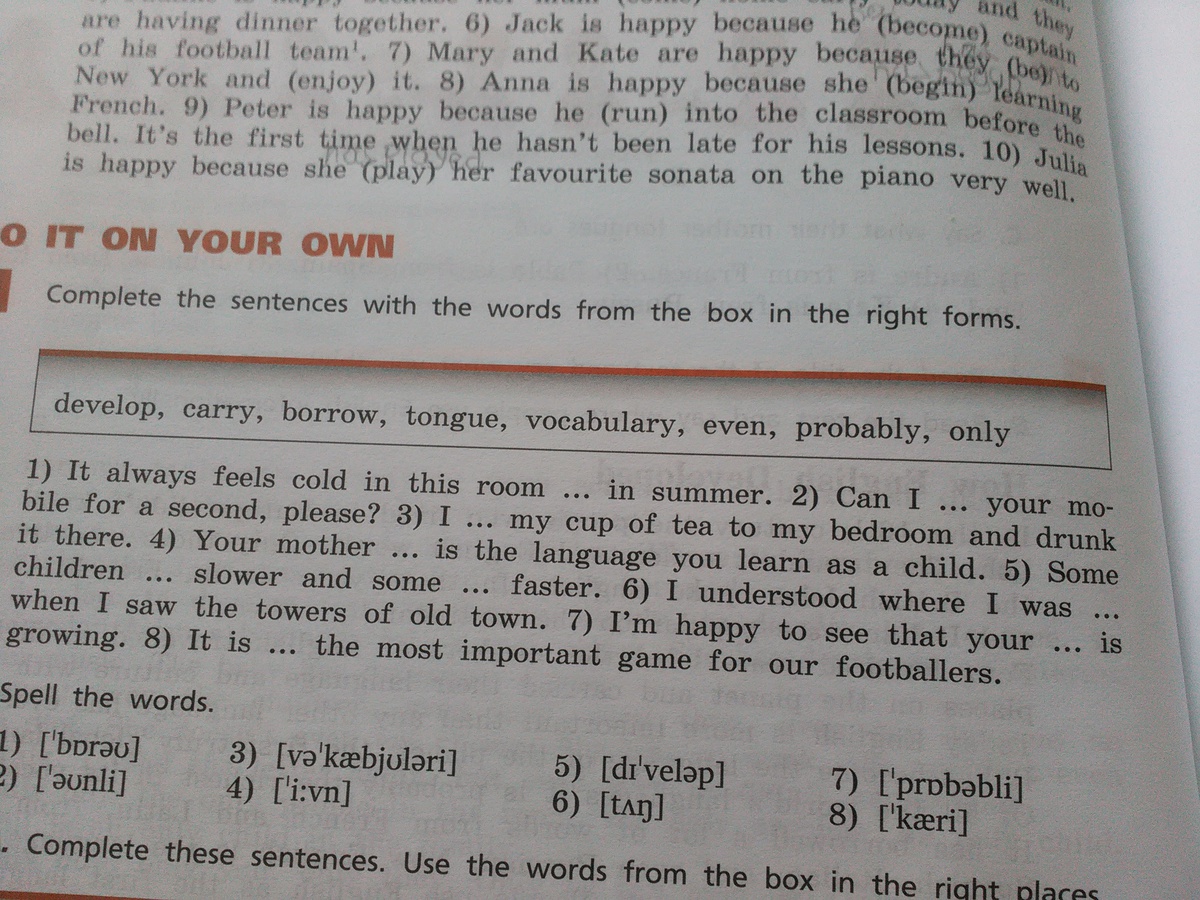 1. even 2. borrow 3. carry 4. tongue 5. develop (2 раза) 6.only 7. vocabulary 8. probably