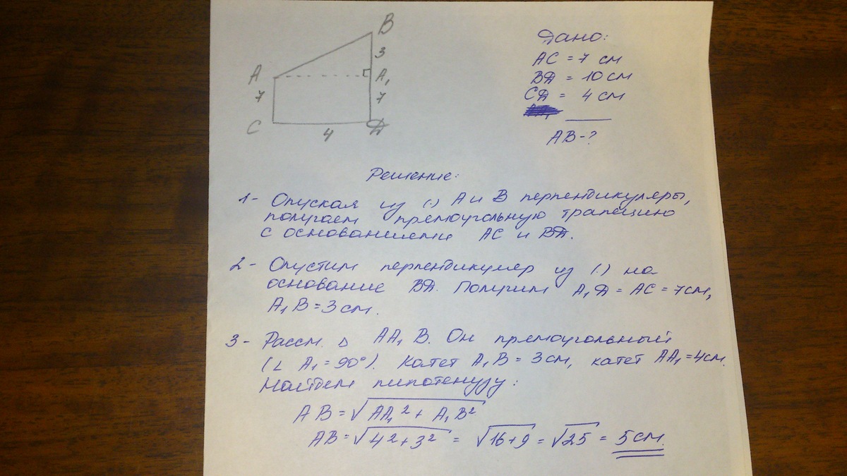 Из концов отрезка АВ,не пересекающего плоскость,опущены перпендикуляры.Их длины 7 см и 10 см, а расстояние между их основаниями равно 4 см.найдите длину АВ...Заранее благодарю!