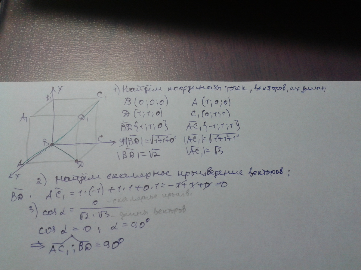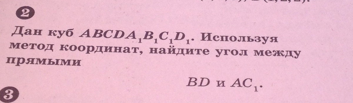 Дан куб ABCDA1B1C1D1. Используя метод координат, найдите угол между прямыми BD и AC1.