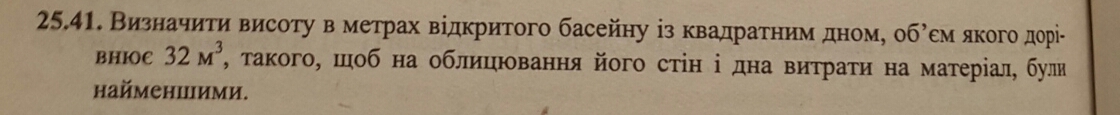 Из прямоугольных параллелепипедов наименьшую площадь поверхности при заданном объеме имеет куб. Таким образом, ребро куба составит корень кубический из 32, т.е. 3,175 метра