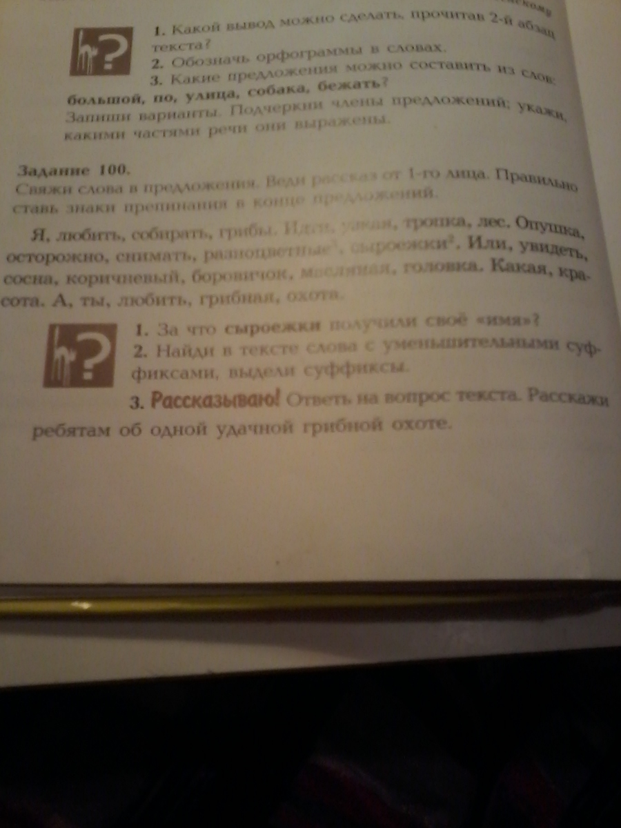 Помогите плизуня! Напишите ПРЕДЛОЖЕНИЯ ОТ 1 ЛИЦА.Правильно ставь знаки препинания. Пишу "текст" : Я,любить,собирать,грибы.Идти,узкая,тропка,лес.Опушка,осторожно,снимать,разноцветные,сыроежки.Или,увидеть,сосна,коричневый,боровичок,масляная,головка.Какая,красота.А,ты,любить,грибная,охота. 1.За что СЫРОЕЖКИ полкчили своё 《имя》? 2.Найди в тексте слова с уменщит. суффикс.