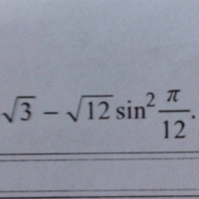 sqrt{3} - sqrt{12} sin^{2}frac{pi}{12}=sqrt{3} - sqrt{12}(frac{1-cosfrac{pi}{6}}{2})=sqrt{3} - sqrt{12}(frac{1-frac{sqrt{3}}{2}}{2})= \ sqrt{3} - sqrt{12} (frac{2-sqrt{3}}{2})= sqrt{3} - frac{sqrt{12}-3}{2}=frac{2sqrt{3} - sqrt{12}-3}{2}=-frac{3}{2}=-1.5