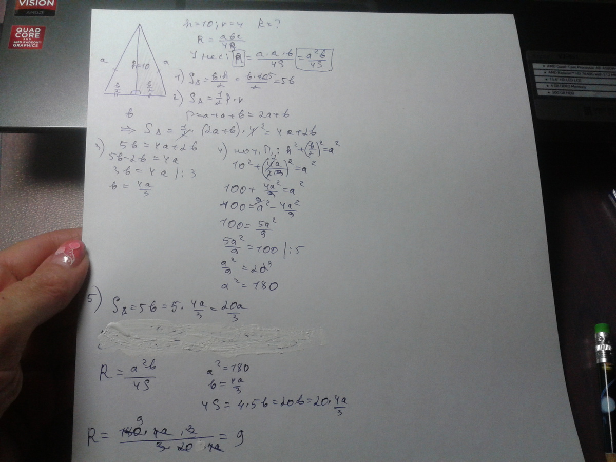a^2 = 100 + (b^2)/4 Или a^2 = 180 отсюда R = 9