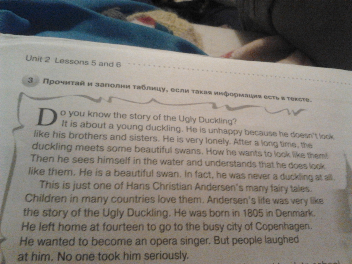 Вы знаете историю Гадкого утенка? Она про молодого утенка. Он несчастлив, потому что он не выглядит как его братья и сестры. Он очень одинок. Спустя долгое время, утенок встречает несколько красивых лебедей. Как же он хочет выглядеть как они! Затем он видит себя в воде и понимает, что он выглядит как они. Он - красивый лебедь. На самом деле, он никогда и не был утенком.