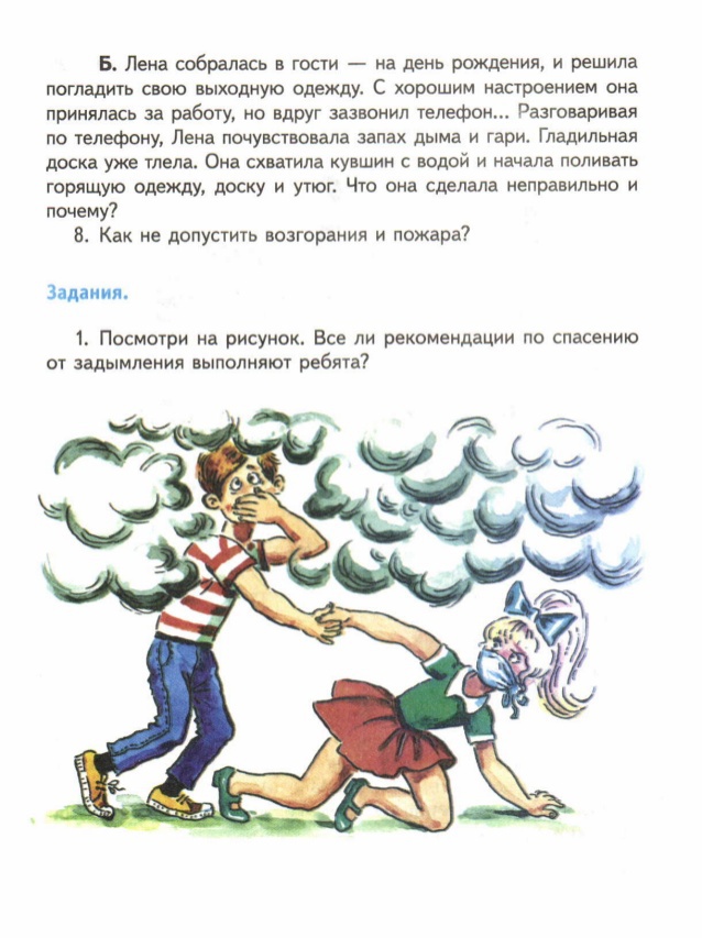 1 Задание.Посмотрите на рисунок.Все ли рекомендации по спасению от задымления выполняют ребята?