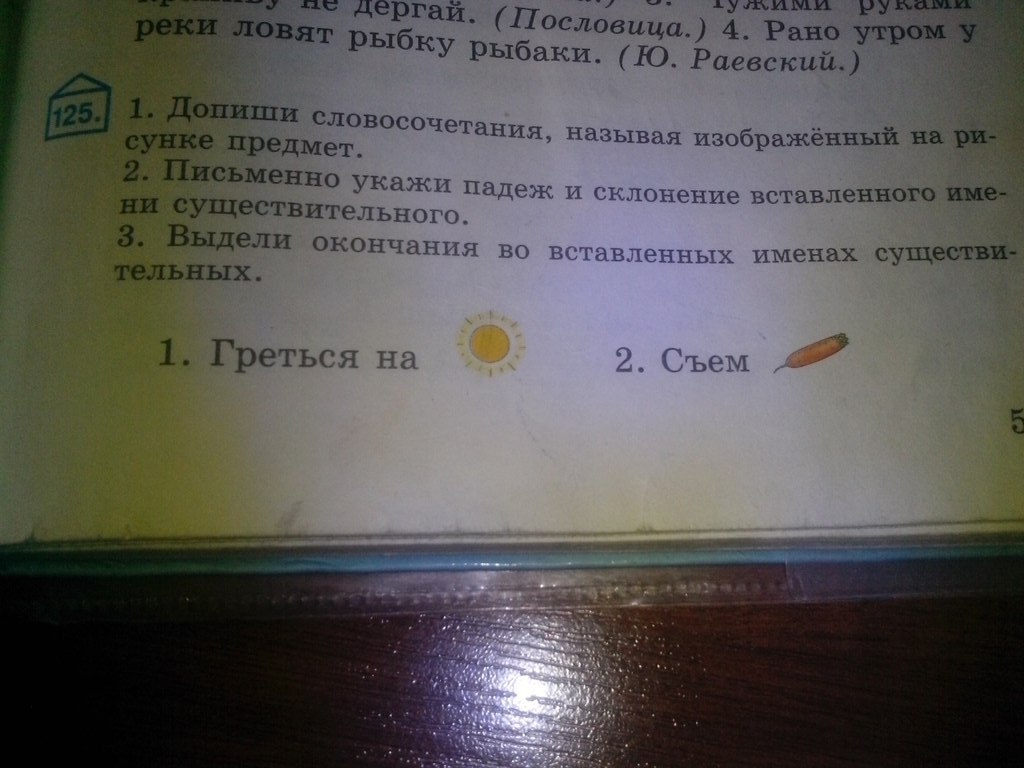 1. Изображено солнце и морковь, значит вместо картинок надо поставить эти слова, только изменить падеж