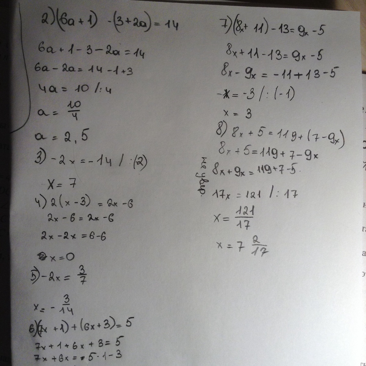 8) 8х+5=119+(7-9х)