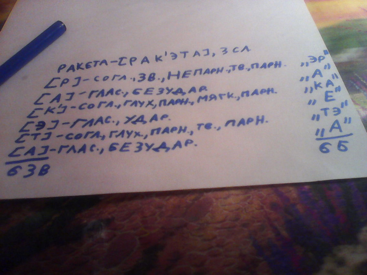 ракета - [рак'эта] - 6 букв, 6 звуков, 3 слога