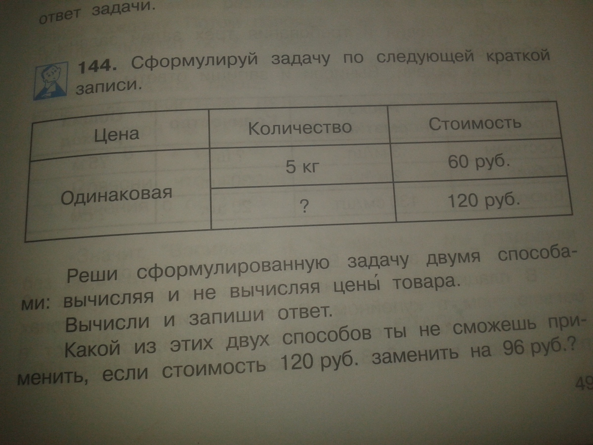 помогите пожалуйста. Реши сформулированную задачу двумя способами:вычисляя и не вычисляя цены товара. вычисли и запиши ответ. Какой из этих двух способов ты не сможешь применить, если стоимость 120 руб . Заменить на 96 руб