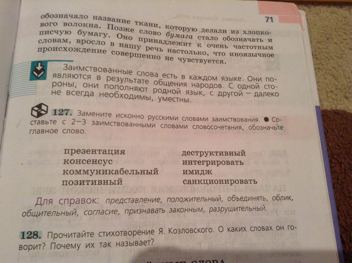 Презентация - представление; консенсус - согласие; коммуникабельный - общительный; позитивный - положительный; деструктивный - разрушительный; интегрировать - объединять; имидж - облик; санкционировать - признавать законным.