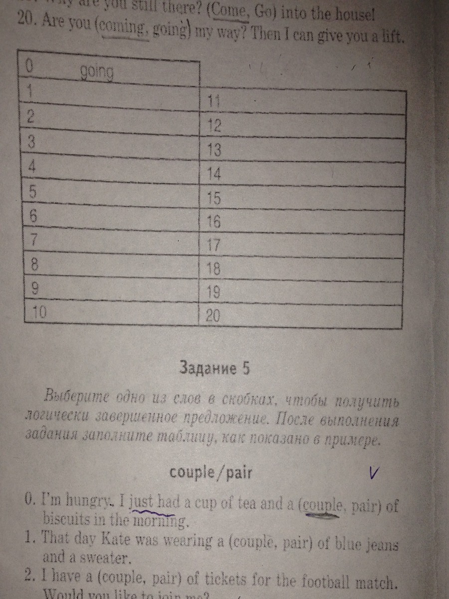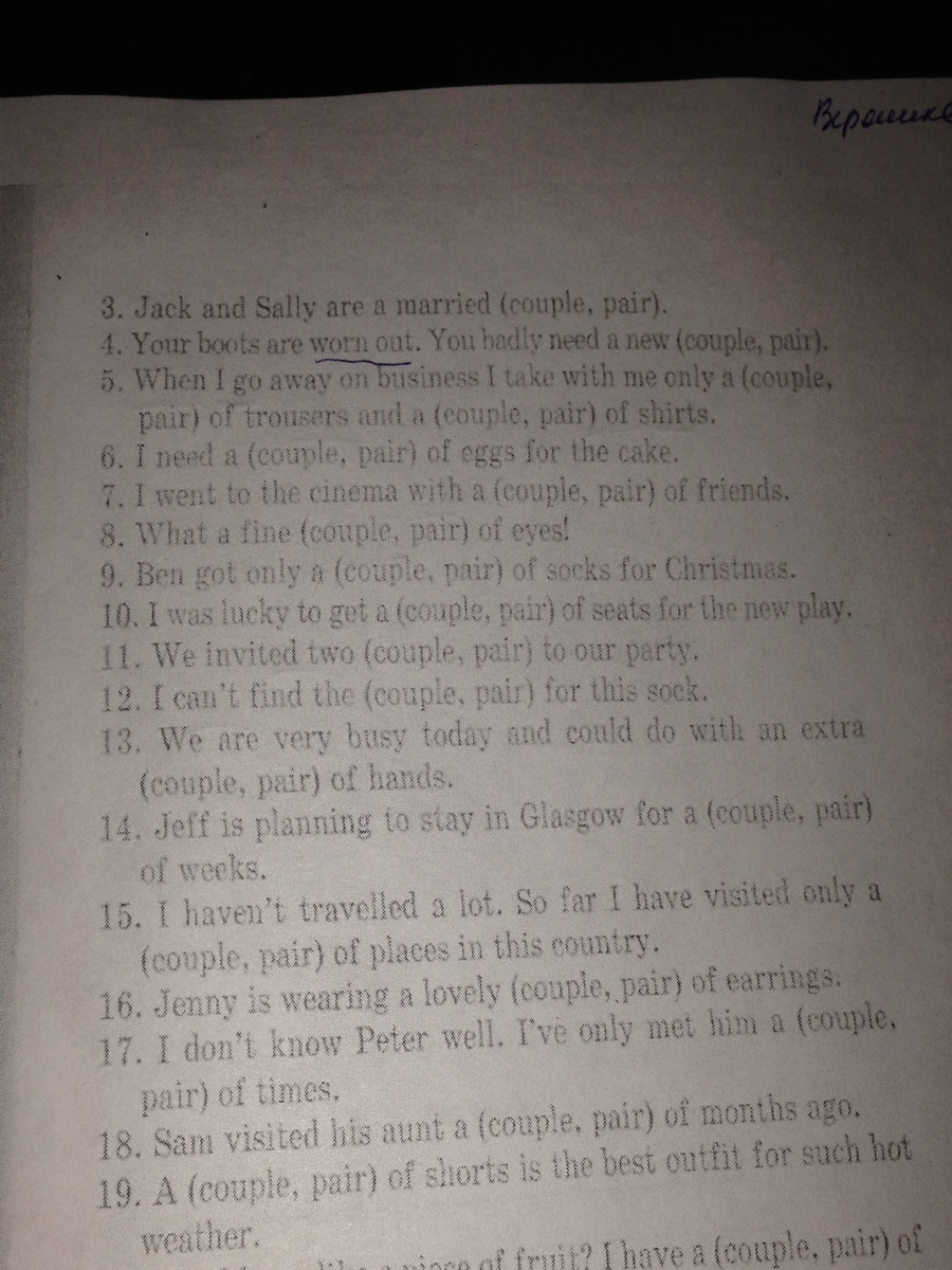 0 – couple, 1 – pair, 2 – couple, 3 – couple, 4 – pair, 5 – pair, couple,
