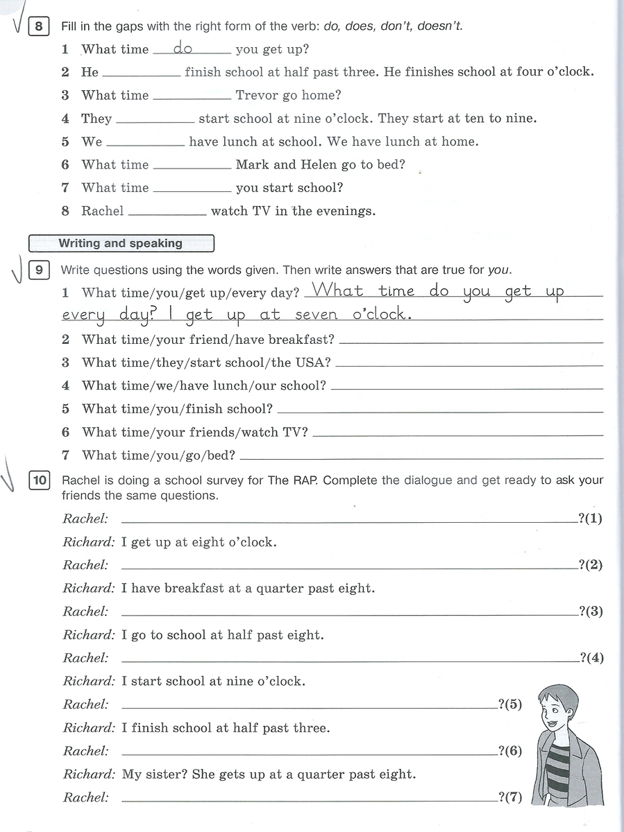 9. 2. What time does yout friend have breakfast? - My friend has breakfast at eight o`clock. 3. What time do they start school in the USA? - In the USA they start school at nine o`clock. 4. What time do we have lunch in our school? - We have lunch at one o`clock. 5. What time do you finish school? - I finish school at three o`clock. 6. What time do your friends watch TV? - They watch TV at seven o`clock. 7. What time do you go to bed? - I go to bed at eleven p.m.