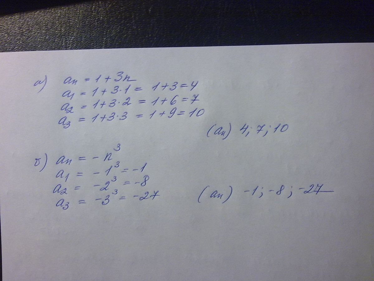 вычислить первые три члена последовательности, которая задана формулой n-го члена А)an =1+3n Б)аn=-n^3