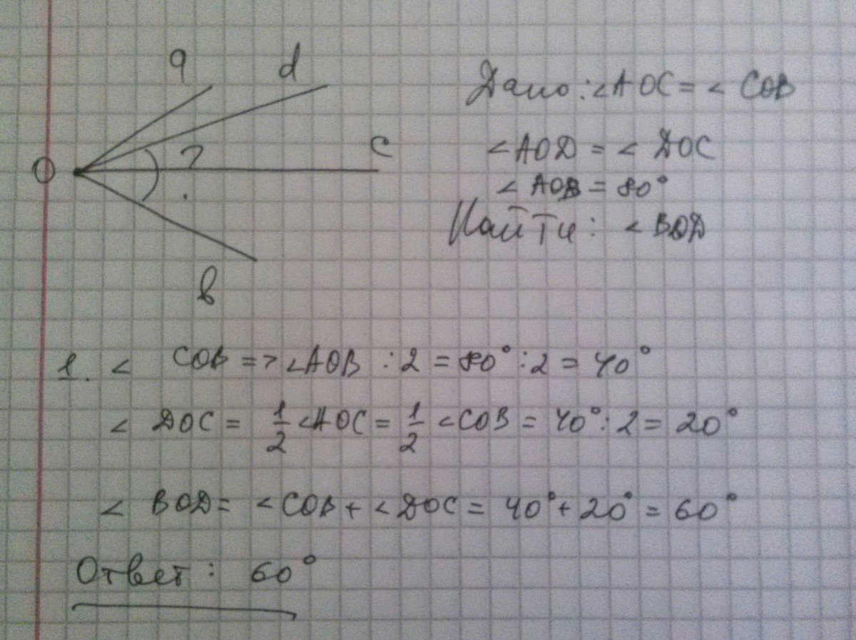 можно, что сразу угол ВОД = ∠АОВ - ∠АОД = 80° - 1/4 = 80° -20° = 60°