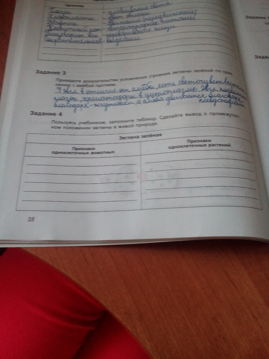 Пользуясь учебником, заполните таблицу. Сделайте вывод о промежуточном положении эвглены в живой природе.