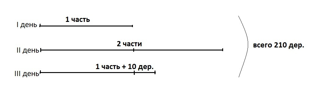 В парке за три дня посадили 210 деревьев.Сколько деревьев было высажено в каждый из этих дней,если в первый день деревьев посадили в 2 раза меньше, чем во второй, а в третий - на 10 деревьев больше, чем в первый?? Запишите ответ выражениями без иксов!! Пожалуйста!!!!