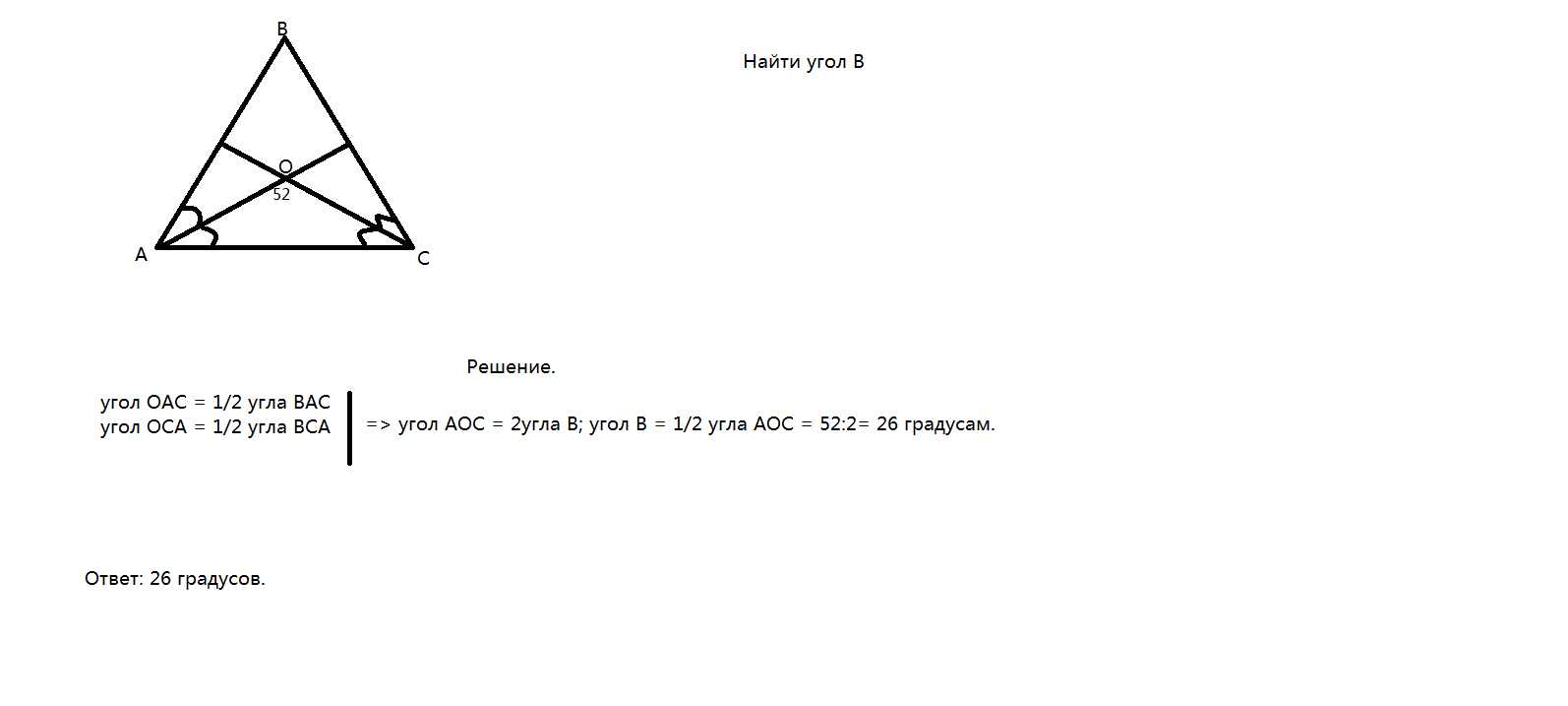 в равнобедренном треугольнике биссектрисы углов при основании образуют при пересечении угол, равный 52 градусам.Найдите угол при вершине этого треугольника