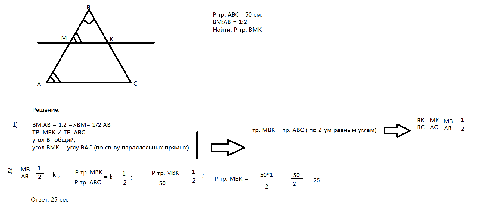 Решите задачку пожалуйста - Прямая пересекает стороны треугольника АВС в точках М и К, причем МК II АС, ВМ:АМ, как 1:2, найдите Р треугольника ВМК, если Р треугольника АВС = 50 см.