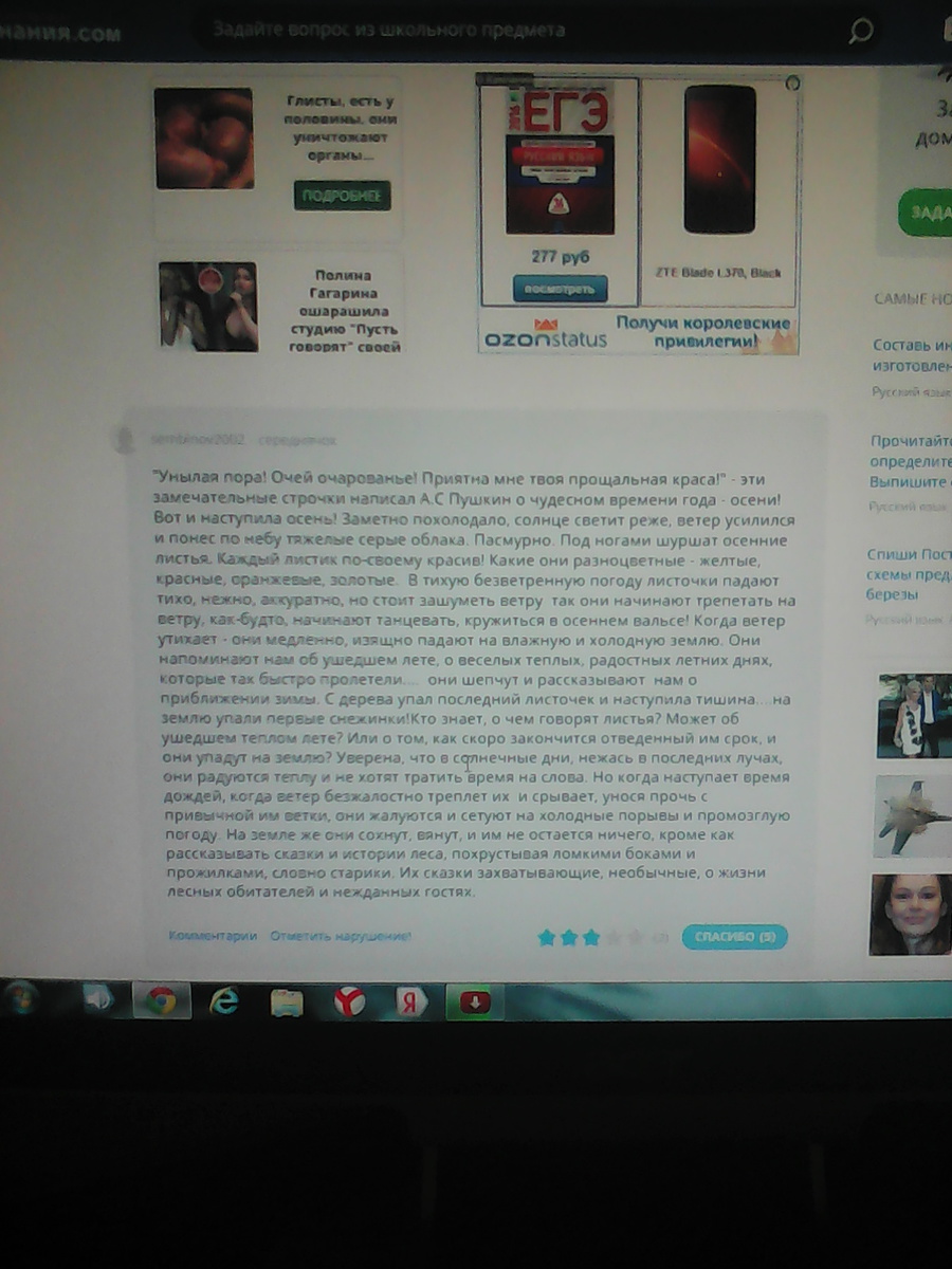 А. Пушкин писал о чудесном времени года как осень. Осенью заметно похолодало и солнце светит реже. Под ногами осенние разноцветные листья. В безветренную погоду листья ложатся на землю тихо, а чуть подует ветерок и они как-будто кружатся в осеннем вальсе.Листья напоминают нам об ушедшем лете и напоминают о начале зимы.С дерева упал последний листочек и наступила тишина. На земле листья сохнут и им остается рассказывать сказки и истории леса о жизни лесных обитателей и нежданных гостях.