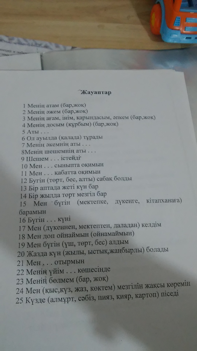 Менің атам бар.Менің əжем бар.Мен мектепте оқимын. Мен сабақты жақсы оқимын. Болашақта дəрігер болғым келеді.