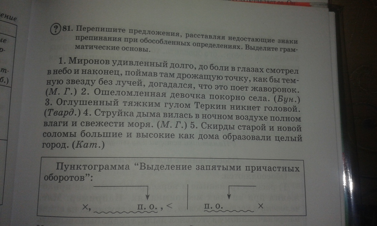 1.Миронов, удивленный, долго, до боли в глазах, смотрел в небо и наконец, поймав там дрожащую точку, как бы темную звезду без лучей, догадался, что это поет жаворонок. Миронов- подлежащее, смотрел и догадался -сказуемые.