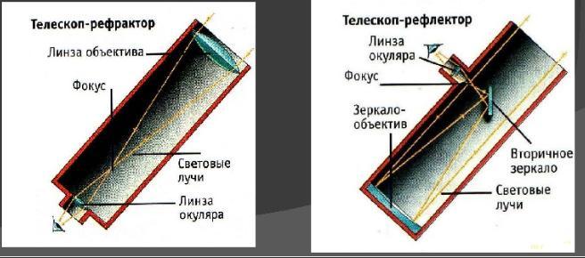 2 Зеркальные телескопы.Они построены на зеркалах.Их называют ещё рефлекторы.У них объективом служит вогнутое зеркало.Объектив находится в задней части трубки.