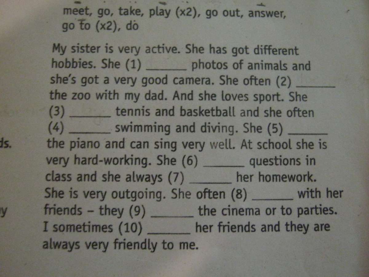 Сперва вставьте : doesn t или don t , а потом глаголы которые даны. у меня всё во влажениях!!!