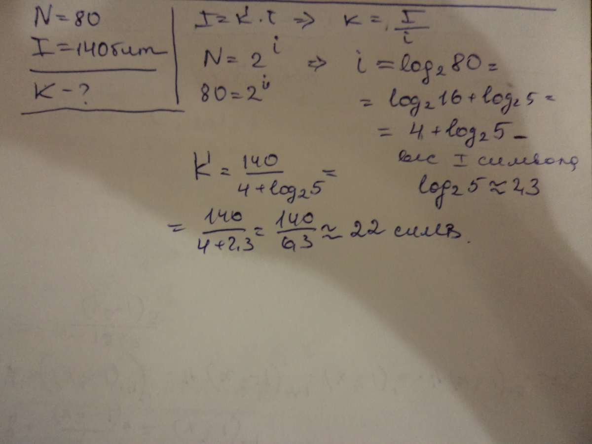 2)-Сколько символов содержит сообщение, записанное с помощью 80-символьного алфавита, если объём его составил 140 бит?