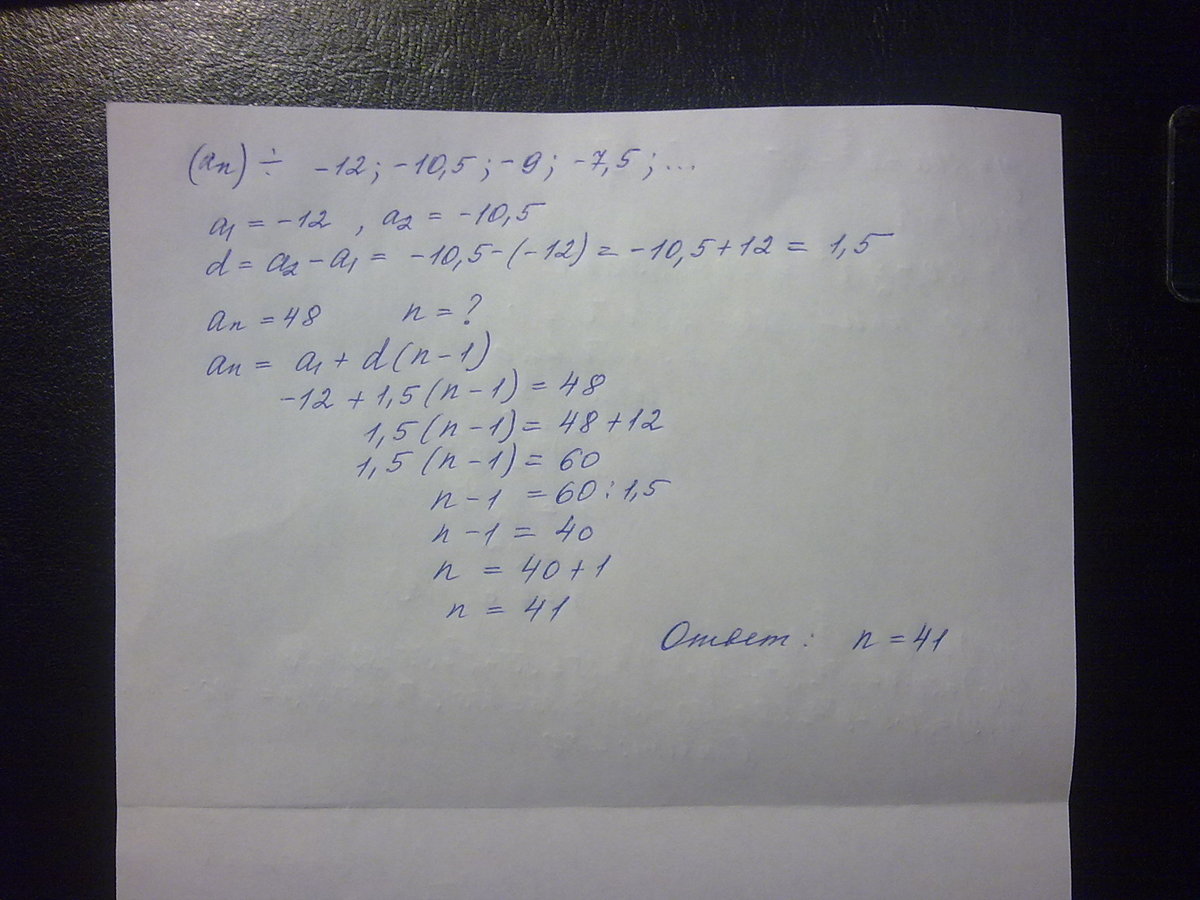 каков номер имеет член арифметической прогрессии, равный 48? арифметическая прогрессия -12; -10,5; -9; -7,5; ...