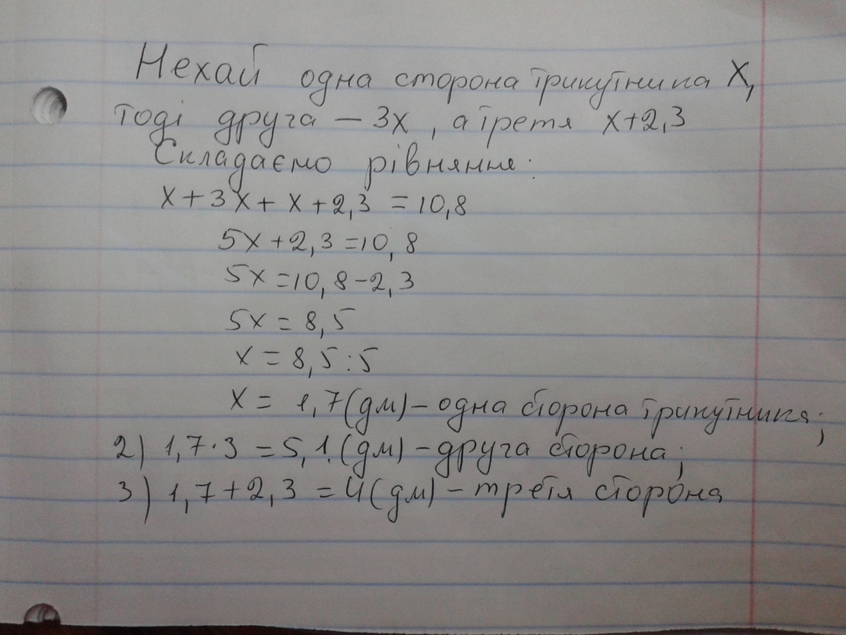 одна сторона трикутника в 3 рази менша за другу і на 2,3 дм менша за третю Знайти сторони трикутника, якщо його периметр дорівнює 10,8