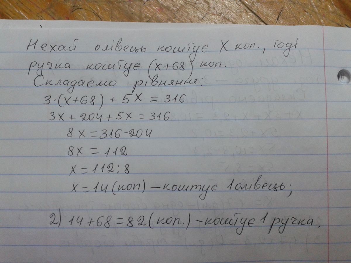 за 3 ручки і 5 олівців заплатили 3 грн 16 кп скільки коштує 1 ручка і скільки 1 олівець, якщо олівець дешевший за ручку на 68 кп