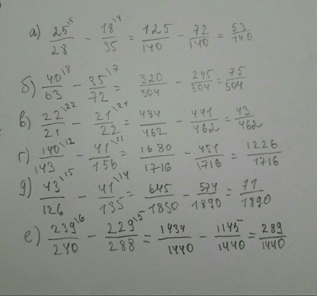вычислите а)25/28-18/35 б)40/63-35/72 в)22/21-21/22 г)140/143-41/156 д)43/126-41/135е)239/240-229/288